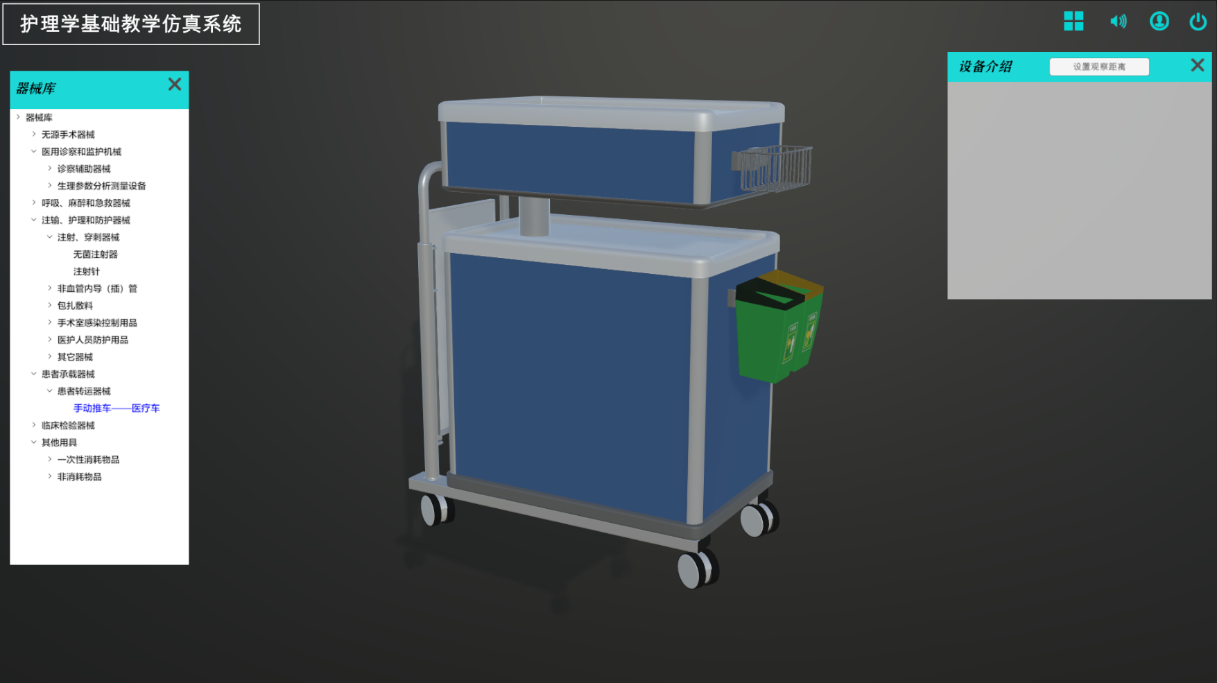 護理虛擬仿真系統(tǒng)-器械學(xué)習(xí)模塊:提供標(biāo)準(zhǔn)器械庫,器械庫中包含全部實訓(xùn)科目中需要用到的醫(yī)療器械,所有器械分類編碼按照《國標(biāo)-醫(yī)療器械分類目錄2018》標(biāo)準(zhǔn)分類。所有器械全部包含720度全視角認知、設(shè)備使用、儲存、養(yǎng)護說明等。